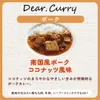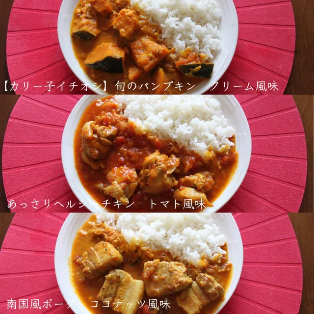 ・チキン ①ホールスパイス カルダモン、クローブ、スターアニス、シナモン ②カレーペースト トマト、トマトジュース、オニオンソテー、ココナッツミルク濃縮物、にんにく、しょうが、食塩、スパイス ・ポーク ①ホールスパイス マスタードシード、カルダモン、クローブ、スターアニス ②カレーペースト ココナッツ濃縮物、トマト、トマトジュース、オニオンソテー、にんにく、しょうが、食塩、スパイス ・パンプキン ①ホールスパイス マスタードシード、シナモン、フェヌグリークシード ②カレーペースト オニオンソテー、トマト、トマトジュース、生乳、にんにく、しょうが、スパイス、食塩、砂糖