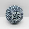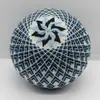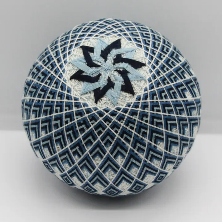 風車模様の藍てまり。 広瀬絣の藍染め糸を使い、幾何学模様の糸かがりを施した縁起の良い、日本の伝統的なデザインです。 直径12センチの大きさです。