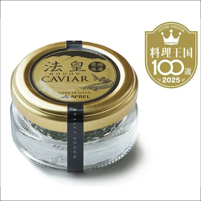 愛媛県法皇山脈の湧き水で育ったキャビアフィッシュの鮮度抜群のキャビア。 一粒一粒がまろやかなキャビアです。 愛媛県法皇山脈の湧き水で育ったキャビアフィッシュから採れる、鮮度抜群のキャビア。 良質な環境で、丁寧に育てられたキャビアは一粒一粒がとてもまろやか。西洋料理はもちろんのこと、和の料理にもマッチし、料理をひときわ輝かせます。 また、外国産のキャビアのように低温殺菌をしないため塩分濃度も3%と低く、キャビアそのものの味わいが楽しめます。 濃厚でクリーミー、それでいてクリアな味わいを持つ、贅沢な国産フレッシュキャビアです。 法皇キャビアは『料理王国100選 2025』に選ばれました。 原産国/日本(愛媛県) 原材料/チョウザメ卵(愛媛産)、岩塩 内容量/10g 保存方法/要冷凍(-18℃以下) お届け方法はクール(冷凍)便となります。 冷凍食品ですので解凍してお召し上がり下さい。 解凍後は冷蔵(5℃以下)で保存し、5日以内にお召し上がり下さい。