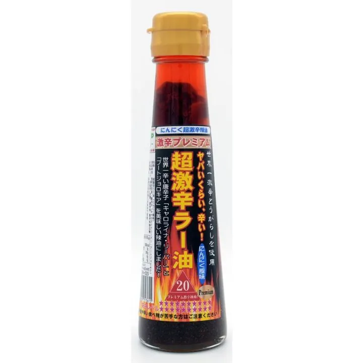 ★テレビ番組(有吉ゼミなど)や、YOUTUBEなどの激辛企画で、しばしば紹介されている超激辛ラー油です!本当にヤバい辛さですので、ご使用の際は分量などにくれぐれもご注意ください。 ★ギネス世界一認定の激辛とうがらしを使用!(キャロライナ・リーパー、ブートジョロキア) ★美味しくて激辛「ただ辛いだけではありません」香味野菜をたっぷり使用した超激辛辣油です! ★辛さは5辛・10辛・15辛・20辛、にんにく5辛・にんにく10辛・にんにく15辛・にんにく20辛の全8種類。20辛は一般的なラー油の50倍以上の辛さです。 ★ラーメン・麻婆豆腐・パスタ・焼きそば・焼き肉中華風冷奴・エビチリ・担担麺・塩焼きそば・おひたし・たこ焼きなど、ぜひお試しください!焼き肉のたれに少し加えたり、味噌汁にもお使いいただけます。豚キムチや鍋料理にも最適です! ★辛い食べ物がお好きな方は是非一度お試し頂きたいラー油です!少しでも辛さが際立つので経済的です。 【原材料・成分】 食用大豆油、唐辛子(キャロライナ―リーパー・ブートジョロキア)、野菜(長ねぎ・生姜)、香辛料、香辛料抽出物 【保存方法】 直射日光、高温多湿を避けて保存してください。
