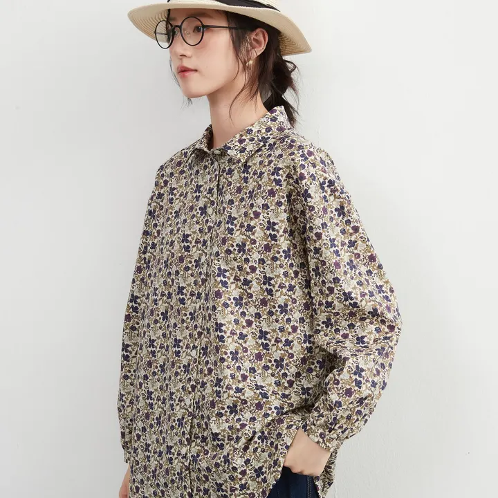 KNXC501・綿100%花柄プリント長袖ブラウス・スタンダードカラーシャツ・ナチュラル春秋トップス PRINT/M