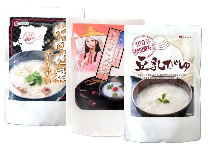 ①こまちがゆ 原材料:精米(秋田県産あきたこまち) ②比内地鶏ぞうすい 原材料:米(秋田県産あきたこまち)、比内地鶏(秋田県産)、舞茸(秋田県産)、食塩、ごぼう ③豆乳がゆ 原材料:精米(秋田県産あきたこまち)、豆乳(大豆(秋田県産))