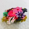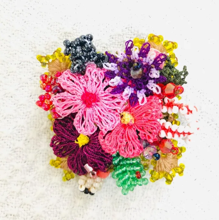 サイズ:直径約5cm 色鮮やかなお花に様々なビーズや天然石などをちりばめた色鮮やかなブローチ とても丁寧に作り上げられています。 ひとつつけると胸元を華やかに演出します。スカーフにとめても素敵です。 トルコの伝統手芸 oya 起源は不明らしいのですが、大昔は 魚を捕る網がすでにその技法だったといわれています。 イスラムの女性たちは髪を隠すためにスカーフを覆います。 はるか昔に使われていたその技法が、イスラムの文化圏でスカーフの縁どりに 装飾されおしゃれを楽しむようになったようです。 オヤはトルコ語で縁飾りを意味します。 技法や手法によって呼び名が変わるそうです。 針を使う技法、かぎ針を使う技法 または、ビーズや石などを編みこんでいる手法など。 手作りの為サイズには多少の誤差があります。