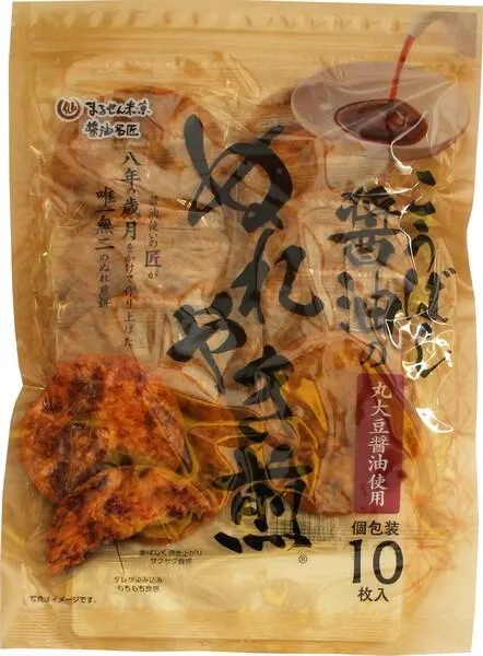 こんがいと焼き上げたお煎餅に、丸大豆醤油を使用のあっさりとした甘口のタレを染み込ませました。 醤油の香ばしい薫りと、しっとりでザクザクした食感が自慢のぬれ煎餅です。