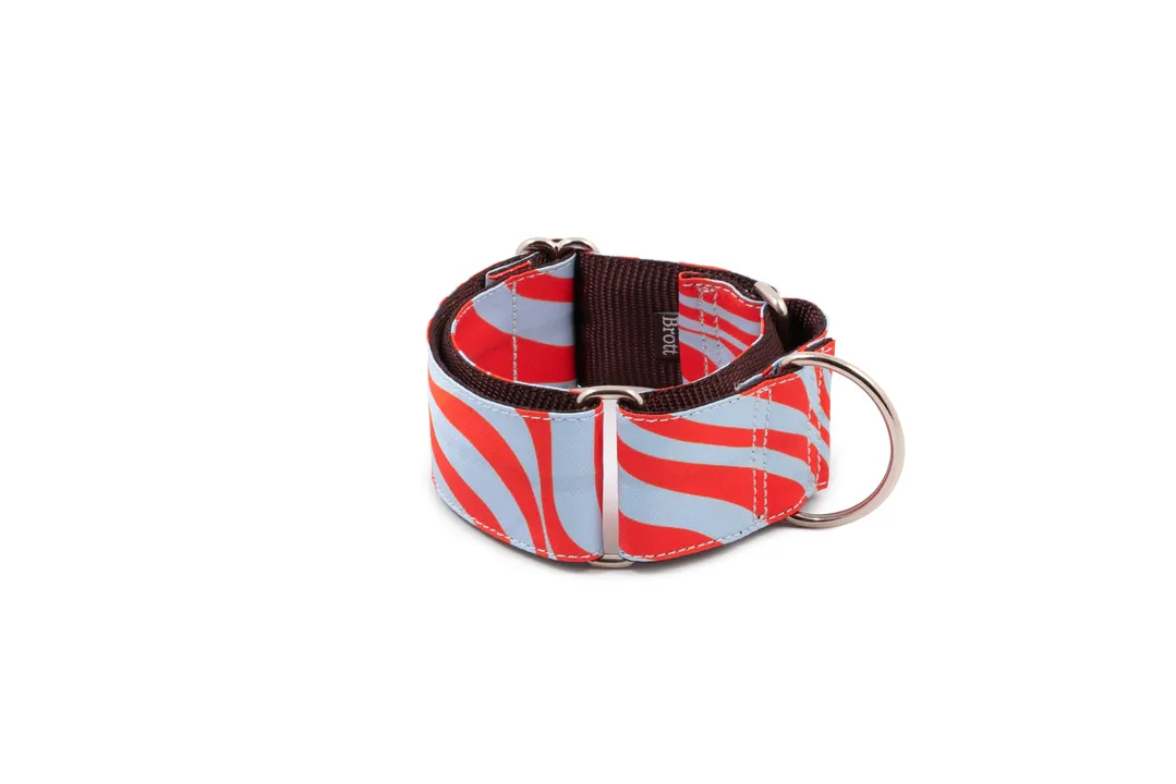 2025新色 ? 情熱的なレッドとライトブルーが織りなす、視線を奪うサイケデリックなカラーリング。リズムを刻むような曲線とコントラストが魅力のプリントは、見る人の心を惹きつけます。 この春夏のグラフィックトレンドからインスパイアされ、工房でリサイクル素材を用いて一点ずつハンドメイド。 「ストリートスタイルの主役は犬だってなれる」——そんな遊び心とエネルギーを詰め込んだ首輪です。 ? マーチンゲールカラー 幅が4cm、5cmと通常よりもかなり広めに出来ております。頭と首が細長く通常の首輪では抜けてしまうハウンド犬種に、特にぴったりのハーフチョークタイプです。? ハウンド系犬種以外でも幅広くお使い頂けます。頭からかぶせて着用するので、頭のサイズも合わせてご確認ください。