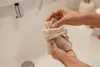 液体シャンプーや液体洗剤の配分量7〜8割が水と言われており、ボトル容器はほとんどがプラスチックが使われております。それらは「ペットボトル」ではなく「プラスチック容器」と区分されるため、リサイクルされずに可燃ゴミとして処理されるケースが多いです。一方で固形石鹸は紙で包まれているものが多く、プラスチックフリーな選択をしやすい。また、小さくなった石鹸を集めてソープバッグに入れると最後まで無駄なく使い切ることができます。バススポンジの代わりになり旅行先にもオススメです。