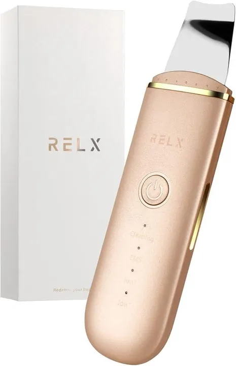 【一台で4役!自宅で本格エステ RELX(リラクス)WATER PEELING】 サロンで人気の機能を4つ搭載し、自宅にいながら極上のスキンケアを体験していただけます。水と超音波の振動により毛穴の汚れや古い角質を除去するため肌の負担を最小限にし、優しくケアすることができます。毛穴汚れを取り除くだけでなく、化粧水や美容液の浸透をサポートしツヤのある美肌へ導きます。自動電源オフ機能を備えており、各モードの動作開始時から5分後に電源が自動でオフになります。 【イオンのチカラでうるおい肌に】Ion+はクレンジングや洗顔では落としきれないメイク残りや皮脂汚れを浮かせます。鼻や顎など毛穴の汚れが気になる部位に使用すると効果的です。Ion-は化粧水や美容液の浸透をサポートします。フェイスマスクをしながら使用すると更に浸透力がアップし効果的なケアができます。 【水と超音波振動でキレイな素肌に】1秒約25,000回の高周波振動で水分をミスト化させて、毛穴に詰まった汚れや古い角質などを浮かせて弾き飛ばすことで健康的な素肌を保ちます。【EMSモード:リフレッシュ機能】超音波振動と微電流の2つの機能でスッキリとしたハリのある印象へ導きます。 【付属品】USB充電コード、日本語取扱説明書付き。※充電時には定格電源DC5V=1A以下のものをご使用ください。 【使用方法】 週1~2日、一日1回10分以内でご使用ください。各モード使用時間は2~3分程度(あくまで目安となります。ご自分の肌の様子を見ながら使用してください) STEP1:洗顔後、水または化粧水を顔に塗布します。※乾いたお肌には使用しないでください。STEP2:ヘッドはやさしく、撫でるように顔全体に滑らせます。※同一部分に留めず、動かして使用してください。 【POINT】〈Cleaningモード〉肌の負担にならないようにできるだけ多くの水を肌に塗布してください。〈EMSモード〉頬の下から目元にかけて、フェイスラインは下から上に向かって動かしてください。〈Ion+モード〉鼻や顎など、毛穴汚れの気になる箇所に使うのがオススメです。〈Ion-モード〉フェイスマスクを貼った上から使うと、より透明感のある肌へ導きます。