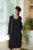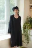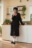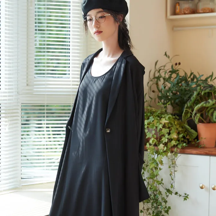 二枚仕立て風のデザインがポイントのワンピースです。 見た目はトレンチコートを羽織っているかのように見えますが、実際には一枚のワンピースです。 ボタンを開けると内側のワンピースが露出し、ボタンを閉めるとレイヤード風の着こなしになりますので、フェイクデザインのユニークなコーディネイトが楽しめます。 素材は春秋に程よい厚さのドレープ感のあるお手入れ簡単素材です。 #初秋#レディースワンピース#ワンピース#レイヤード#フェイクレイヤード#トレンチコート#レトロガーリー#大人ガーリー#アップサイクル#再生繊維#長袖ワンピース#黒系#シンプル#コーディネート楽#ミニマル#パッチポケット#ワンボタン#フリーサイズ#体系カバー