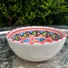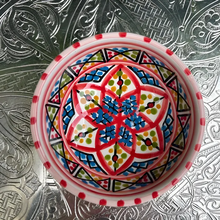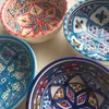 サイズ:約φ10×高さ4.5cm ※デザインは入荷時により多少異なることがございます。 チュニジアで陶器の町といえば「ナブール」 鮮やかな手つきでロクロを回し、その後で皿に絵付けをしている女性の手つきの見事さに感嘆。 たくさんある中でもよりすぐりの皿ばかりを選んでおります。 *「ナブール」は観光客だけでなく、チュニジア人でも陶器を買いに行くときは「ここ!」、というほど陶器の街として知られています。 この町の工場で職人が1点1点鮮やかな手つきでロクロを回し、皿に絵付けをしている女性の手つきの見事さに感嘆します。 中心から放射線状に広がる模様は、ほとんどの工房がこの柄で絵付けするほどオーソドックスです。 色鮮やかな文様は食べたあとでも食卓を華やかに演出してくれます。 *400年以上歴史のあるチュニジア伝統の絵付け陶器の街ナブールから、地中海の風をお届けします。 *ナブールは瀬戸市と姉妹都市です。