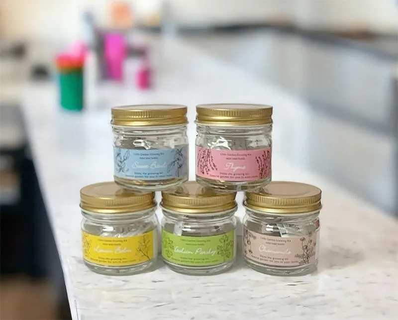 小さな瓶にハーブの栽培キットが入ってる♪プレゼントにも自分用にも可愛くてお手頃価格です! 種と説明書・土が入ってます。土は圧縮乾燥されてますので水分で膨らませて種を蒔くだけです。瓶の中で栽培を楽しめますので場所も取らず簡単です。 人気のハーブを5種類そろえました。結婚式のプチギフトに、店舗様での記念日のお配り物として、会社様でのイベントの景品として、もちろん一般のご販売でも幅広くお使い頂けます。 ※サンプルは5種類の中からどれかをお送りいたします