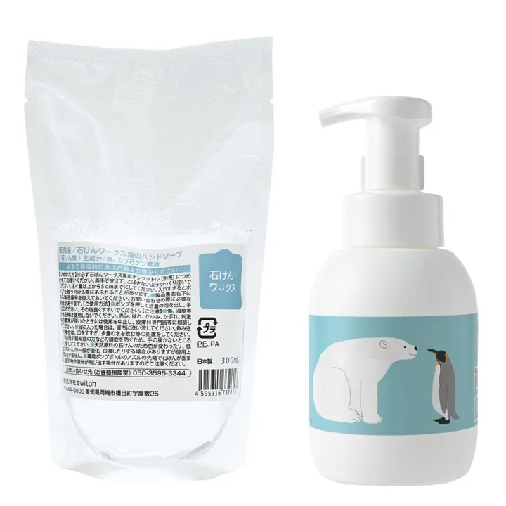 石けんワークス 無添加泡のハンドソープ つめかえ用 300mL + 石けんワークス泡用ポンプ容器(シロクマとペンギン) シロクマとペンギン「お話中」