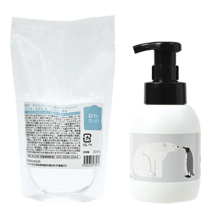 ● 石けんワークス 無添加泡のハンドソープ つめかえ用 300mL 【全成分】水、カリ石ケン素地 【容量】300mL 【寸法】200 × 120× 40(h×w×d/mm) 【重量】309g 【パッケージ材質】 PE、PA 【製造国】日本 【商品特徴】 ・ 泡切れよく少ない水でキレイが簡単!サッパリとした使用感でヌルヌルせず少ない水でキレイが簡単。キャンプやバーベキュー、アウトドアにもおススメ。石けんワークスのハンドソープは生分解性※に優れているので、環境にも優しい。  ※水と炭酸ガスに分解されます ・石けんワークスのハンドソープは、純石けんと水だけでできています。手荒れが気になる方だけでなく、小さなお子様、全ての肌質の方におススメです。 ・石けんワークスのハンドソープは、水と石けんだけでできています。この水は超微細なフィルター(RO膜)をとおした純水を使っています。また、防腐剤を添加せずに品質を保つため、80℃で30分間加温、さらには製造後に菌検査を実施、在庫も定期的に品質確認を実施しています。 ● 石けんワークス泡用ポンプ容器 【原料樹脂】ポンプ材質:ポリプロピレン、ポリエチレン / ボトル材質:ポリエチレン 【容量】350mLサイズ 【寸法】158×77×77(h×w×d/mm) 【重量】69g 【製造国】日本 【商品特徴】 ・ワンプッシュごとに豊かな泡立ちの石けんが吐出されます ・スムースで滑らかな押し心地 【デザイン】 シロクマとペンギンシリーズ ・ブルー - シロクマとペンギンがなにやら「お話中」 ・ネイビー - シロクマのおなかでとペンギンが「ほっこり」中 ・ピンク - ペンギンが「やぁ!」とシロクマの背中をトン! ・レッド - シロクマにペンギンが「調子はどう?」 ・グレー - 「お話中」の背景をクールなグレー色に。ポンプのカラーブはラック。 (イラスト作家:chihiro 作 )