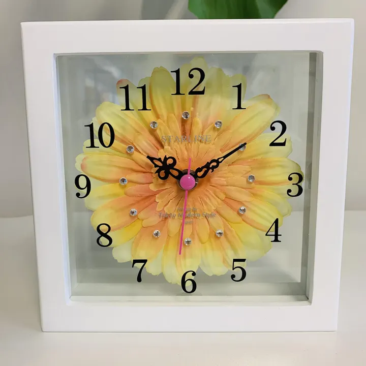 3枚のクリアなガラスに黄色いガーベラの造花を挟んだ、かわいくておしゃれな置き掛け兼用時計です。 後ろのフックを壁に固定したら、壁掛け時計としてもお使いいただけます。 美しく鮮やかなガーベラの造花は、爽やかさと同時に豪華な空間を演出します。 どんなインテリアにも調和し、日常を彩るアートピース。時間の経過を優雅に告げるこの時計は、目にするたびに笑顔を運びます。 リビング、寝室などはもちろん子供部屋でも可愛い! またガーベラには「希望」「前向き」「常に前進」という花言葉があります。 黄色いガーベラの花言葉には「やさしさ・親しみやすさ・究極の愛」という意味があります。 コンパクトなサイズで、母の日、誕生日、開店祝い、記念日など様々なシーンのプレゼントにも最適です。 ぜひこの機会にご利用くださいませ。