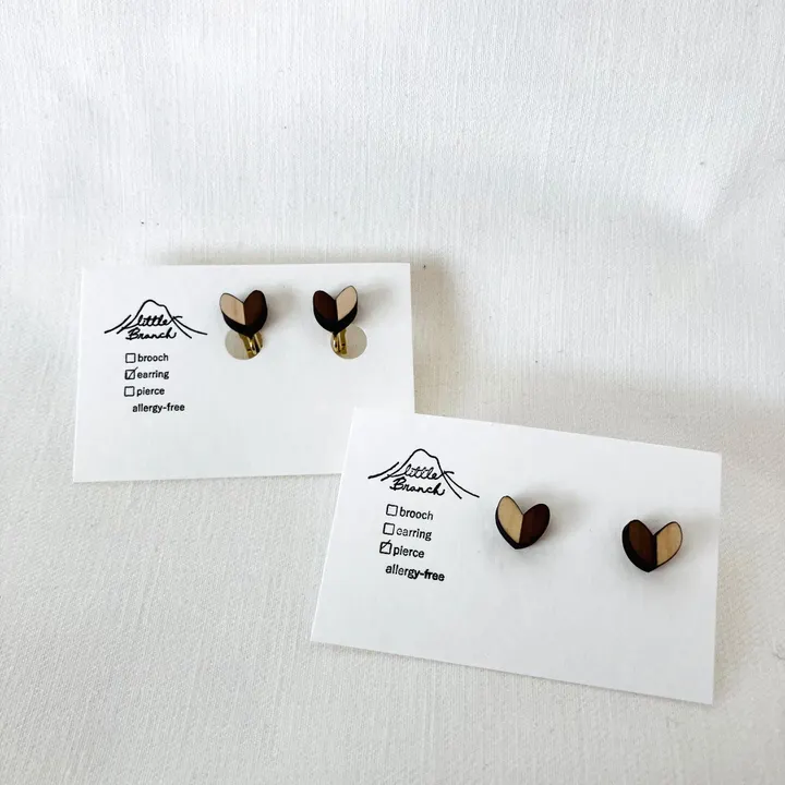 毎日の半歩先へ。 地域の木を身につけることを日常に。 地域の木、主に愛媛の木を使ってアクセサリーを作っています。 森林大国である日本の木を使ったものを身近にすることで 木の良さ、またその先にある森林への繋がりを感じてもらいたいと思っています。 小さなハートのモチーフ。 イヤカフなどとの重ね付けも可愛いです。 【ピアス金具】 ポスト:ステンレスまたはチタン キャッチ:シリコン 金属アレルギーを起こしにくい素材を 使用しております。 【イヤリング金具】 痛くなりにくいクリップ式の金具です。