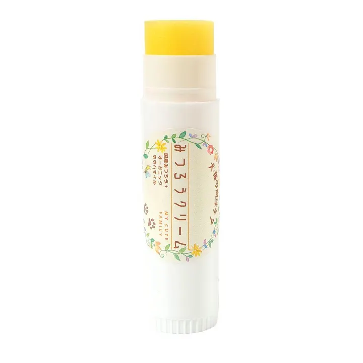 【獣医師推奨】みつろうクリーム My Cute Family、大人気リップスティックタイプに大容量サイズが仲間入り♪ 通常タイプの約3倍の容量です。可愛いお花ラベルでお届けします。 オーガニックゴールデンホホバオイルと国産みつろうで天然成分100%の肉球ケアクリームを作りました。手が汚れず携帯に便利なスティックタイプ。 材料は2種類だけ、天然素材のため舐めても安心です。少量でのびがよく肌なじみがいいため肉球に素早くなじみます。毎日のケアに、そららSORARAの肉球クリームをぜひ一度お試しください。カサカサが気になる肉球を毎日のケアでぷにぷに肉球に。 【仕様】 品名:みつろうクリーム/蜜蝋クリーム 内容量:スティック 1個(16ml) 原材料:オーガニックゴールデンホホバオイル·国産蜜蝋 容器サイズ:高さ9.4cm 直径2.0cm 使用方法:くるくると肉球に優しく塗ってください。 【注意事項】 万が一お肌に合わない場合は使用を中止してください。酸化に強いホホバオイルを使用していますが、酸化防止剤や保存料はいっさい使用していないため6ヶ月ほどで使い切っていただくのが安心です。保管は高温になるところは避けてください。 【詳細説明】 ~オーガニックゴールデンホホバオイル~ 数ある植物オイルの中で一番保湿性に優れ、ビタミン・ミネラルなど栄養豊富なオイルです。酸化しにくく、長期保存できます。天然素材のため、わんちゃん・ねこちゃんに安心してご使用いただけます。 肉球の皮脂成分に約80%含まれている「ワックスエステル」を豊富に含んでいるため、肉球に素早く馴染みます。 さらに化学肥料や農薬を一切使用していない、安心なオーガニックにこだわりました。 ~国産みつろう~ みつばちの巣を構成しているろうを精製したものです。ビーズワックスといわれ、主成分は「ワックスエステル」です。 国産のみつろうを100%使用しており、わんちゃん・ねこちゃんがなめても安心です。