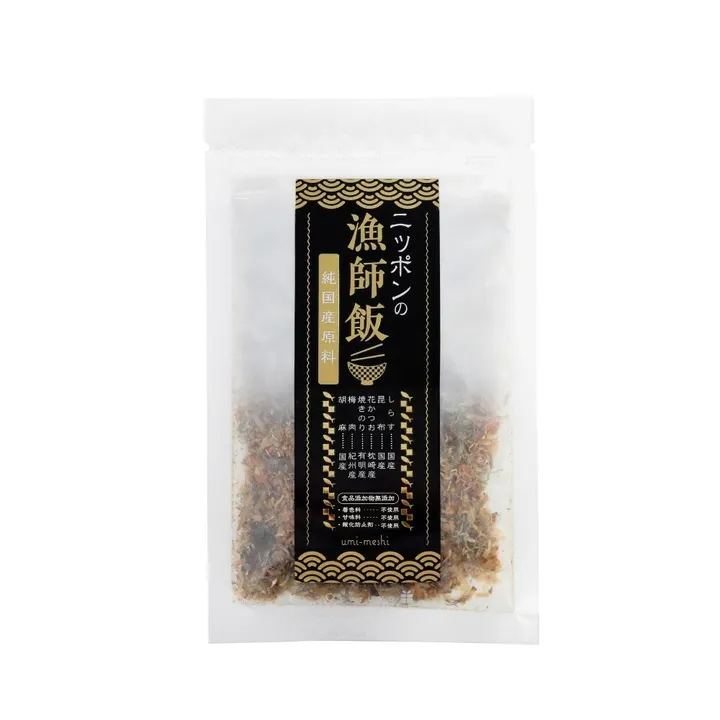 原材料は全て国産。アミノ酸等の食品添加物に頼らず素材を活かしてうま味のある味わいに仕上げました。 昆布とかつお節の旨味に、しらすや海苔、酸味の効いた紀州梅がアクセント。 思わずそのままつまんで食べたくなるふりかけです。 内容量:20g 原材料名:鰹節(国内製造)、昆布加工品(昆布(国産)、醸造酢)、片口いわし(国産)、昆布粒(国産)、いりごま(国産)、焼海苔(海苔(有明海産100%)、乾燥梅肉(梅(国産)、食塩)、紫蘇梅酢)、食塩(国内製造) 賞味期限:180日 栄養成分表示:(100gあたり)エネルギー/224kcal、たんぱく質/35.2g、脂質/7.5g、炭水化物/22.3g、食塩相当量/10.4g アレルギー:ごま お召し上がり方 ♦温かいご飯にたっぷりかけて ♦冷奴には、ちょっぴり醤油を足して ♦麺類にかけても美味しい ♦サラダのトッピングにも 漁師飯は「フードアクションニッポンアワード2020」100選 に選ばれました。 (国産農林水産物の消費拡大を目指し、日本全国の優れた産品を発掘するコンテストです)