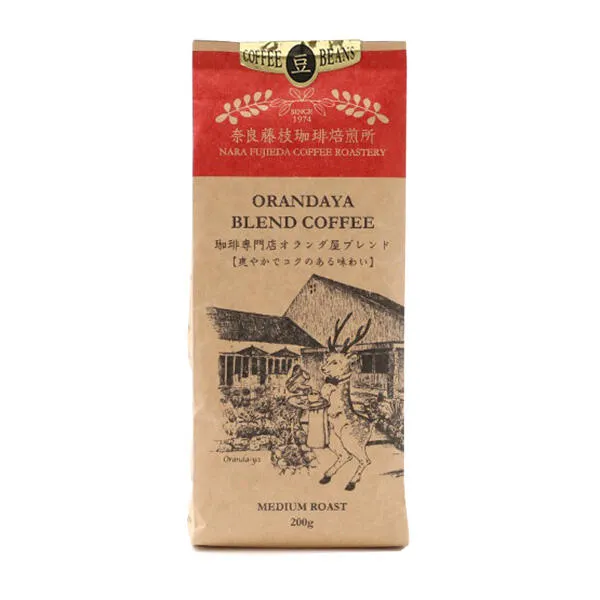 【珈琲専門店 オランダ屋ブレンド】 ORANDAYA BLEND COFFEE 挽きたてコーヒーでおもてなしする珈琲専門店オランダ屋のオリジナルブレンドは、コロンビアを中心に中煎り豆をバランスよく配合したモーニングの定番です。 コク ●●●●○○ 苦味 ●●○○○○ 酸味 ●●●○○○ 内容量:200g