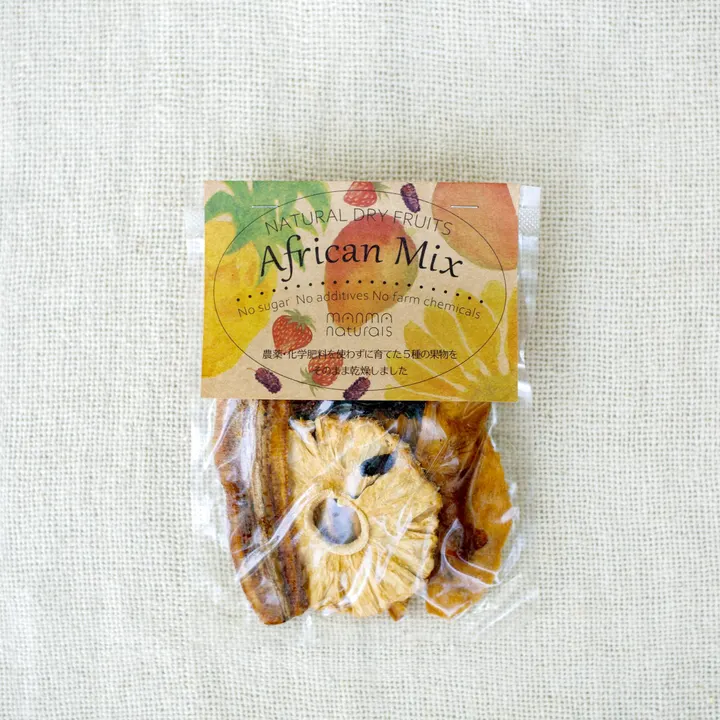 【食品添加物不使用】【砂糖不使用】 アフリカの大地が育んだ濃厚な風味と栄養がそのままの自然なドライフルーツ。 これまで食べていたドライフルーツとは全くちがう美味しさに、多くの方が驚きます。 〖農薬・化学肥料不使用のフルーツだけを厳選〗 原料のフルーツは、どれも農薬や化学肥料を使わず自然栽培で育てています。 マンゴーとパイナップルはEUやアフリカの有機認証あり、バナナ、マルベリー、いちごは野生に近い自然な状態で育ったものを使用しています。(野生すぎるため管理の厳しい有機認証取得は難しい) 〖砂糖や添加物を一切加えていない、自然の美味しさ〗 一般的なドライフルーツに使われている漂白剤や保存料などの添加物は一切使用していません。お砂糖やシロップなども加えずに、収穫した果物をカットし、そのまま乾燥させているだけなので、果物本来の味や香り、甘さが楽しめます。 〖お子様のおやつにも最適〗 保存料を使用していない分、しっかりと乾燥させています。そのため香りと甘味が凝縮され、濃厚な味わいに。噛み応えのある食感も人気です。よく噛んで食べるので、お子様のおやつにも最適です。 ◆フェアトレードで、アフリカの農家を支援◆ 日本からはとても遠いアフリカ。身近な国として意識する機会は少ないかもしれませんが、経済、政治、人権など様々な問題を抱えています。 農業においても貧困や搾取は深刻な問題となっています。さらにフルーツ農家では、収穫期が集中するために、すべてを販売できずに腐らせてしまい、せっかく育てた作物が収入につながらないことも大きな課題でした。こうした余剰生産物をドライ加工することで無駄をなくせればと、ドライフルーツの生産がスタート。加工品にすることで付加価値をつけ、さらに適正価格によるフェアトレードを行うことで農家の収入向上を支援しています。 ◆ナチュラルドライフルーツ 誕生Story◆ マンマナチュラルズの代表新井がバックパックで世界一周の旅に出ていた時、アフリカで見た光景が、ドライフルーツ商品化のきっかけです。訪れたアフリカの田舎では、植民地だった頃の爪痕が色濃く残り、不安定な政治と極度の貧困、そして奴隷のように働かされる女性達など、数々の衝撃的な事実にショックを受けたのです。 それから数年後、偶然にも日本でアフリカのドライフルーツと出会い、完全無添加で砂糖すら使わないそのおいしさに感動。アフリカの人たちが経済的に自立し、女性たちが救われるきっかけになればと、マンマナチュラルズでの商品化を決めました。 ◆エコパッケージ◆ 〖バイオプラスチックを使用〗 袋は日本製のバイオプラスチック製のものを使用しています。石油系のものと比較すると、CO2排出量を約25%削減できます。 プラスチックはいろいろな環境問題を引き起こす反面、利点もたくさんあります。世界から無くすよりも「植物性のものに変えていく」「使用量を減らして大切に使う」ことが必要だと考えています。 〖化学物質フリーを目指して〗 ラベルは化学物質フリーを目指して、接着剤を使うステッカーは使用せず、未漂白のクラフト紙をホチキス止めに。はがす手間もなく分別・リサイクルしやすくなっています。 ご使用後は、リサイクルにご協力お願いいたします。