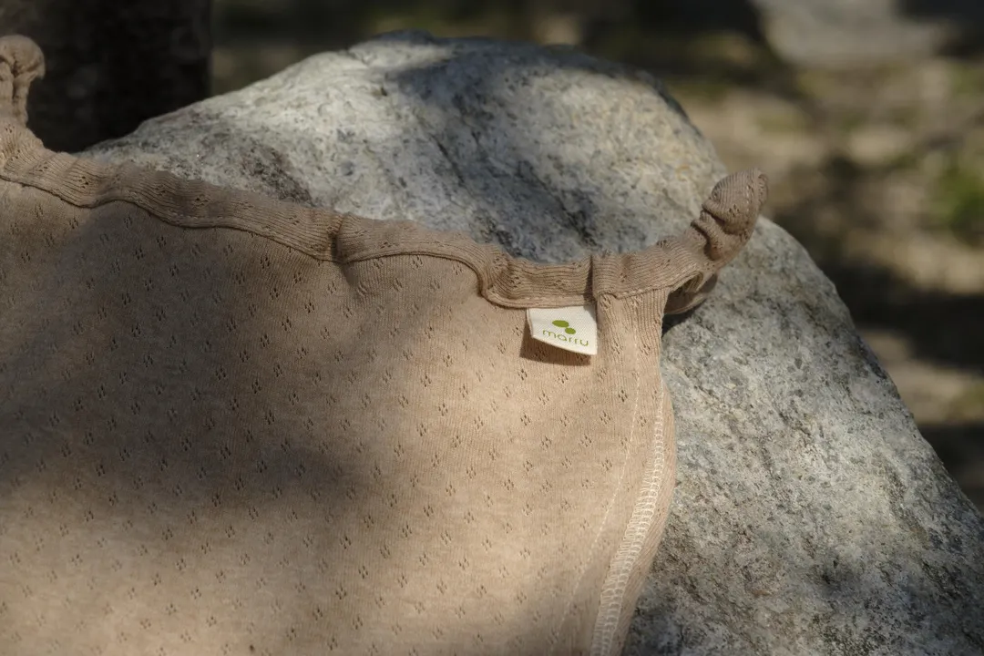 「ふんどし」の良さをそのままシンプルに、現代のショーツの形に。 新月ショーツと並ぶ、マアルの定番商品です。 こちらは、無染色のオーガニックコットン「茶綿」を使用した満月パンツ。 生成りよりさらっとした感触です。 無農薬有機栽培で育てた綿を、極力化学物質を使わず、漂白も染めも一切せずに、国内で丁寧に編んだ生地です。 生地、そして縫い糸までフェアトレードのオーガニックコットン100%。 一般的な下着は伸縮性があり、廉価な化学繊維の糸で縫いますが、 肌が繊細な人は化繊糸に痒みを感じる人が多いため、独自の方法で1着1着、オーガニックコットン糸で縫っています。 綿の栽培から糸づくりまで、世界的なソーシャルプロジェクト=bioRe projectに担われており、 気持ちがいい!と感じた肌着がどこまで遡ってもマアルく気持ちのいいフェアトレードの関係で生まれたものであるようにと願っています。 品質表示ラベルは、あえて外側に。 取り外しやすいよう、大きめのミシン目で本体の縫い目とは別に取り付けてあります。 これも、肌刺激を減らす工夫です。 ゴム交換口を用意してあります(左前のマアルタグの内側あたり)。 お好みの緩め具合に調整したり、 太った、痩せた、妊娠したなどといった体の変化にも対応できます。 マアルのパンツは股上がかなり浅めです。 これは、ゴム部を骨盤輪の上に乗せることで、腸を締め付けないようにするためです。 だから、お腹の大きな妊婦さんでも履き続けることができます。 一見冷えそうに見えますが、 足の付け根(鼠蹊部)やお腹周りを締め付けないことで、 体温の上昇作用も大学との共同調査で明らかになりました。 サイズ:M(W64~70cm H87~95cm)     L(W69~77cm H92~100cm)      (W:ウエスト H:ヒップ)