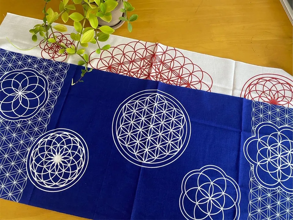 フラワーオブライフ 波動効果日本手ぬぐい 色は、紺地です。 こんなものがあったらいいな。 と自分で使いたいので、フラワーオブライフの波形を日本手ぬぐいにプリントしてみました。 予想以上に 気持ちいいものができました。 首に巻いたり 頭に巻いたり 枕の下に敷いたり もちろん、お部屋に飾ったり。 フラワーオブライフの波動に包まれる優れもの。 手ぬぐいをお水の下に敷くと、味が瞬時に変わります。 使い方は♾️大 楽しんでくださいませ。 数に限りがあります。 ※ご使用なさる前に軽く水通しをしてからお使いください。(すぐ乾きます) ※色落ちする場合がございます。(乾燥機にかけるのはおやめください)