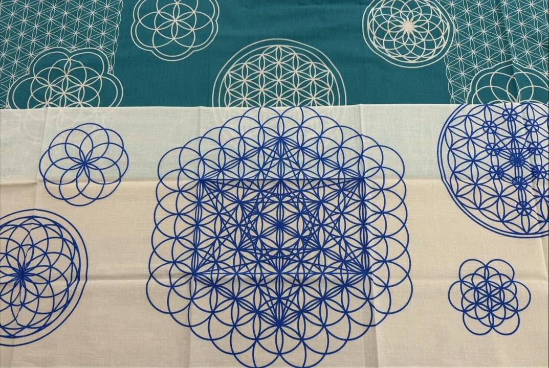 フラワーオブライフ 波動効果日本手ぬぐい 色は、 白地に瑠璃色です。 こんなものがあったらいいな。 と自分で使いたいので、フラワーオブライフの波形を日本手ぬぐいにプリントしてみました。 予想以上に 気持ちいいものができました。 首に巻いたり 頭に巻いたり 枕の下に敷いたり もちろん、お部屋に飾ったり。 フラワーオブライフの波動に包まれる優れもの。 手ぬぐいをお水の下に敷くと、味が瞬時に変わります。 使い方は♾️大 楽しんでくださいませ。 数に限りがあります。 ※ご使用なさる前に軽く水通しをしてからお使いください。(すぐ乾きます) ※色落ちする場合がございます。(乾燥機にかけるのはおやめください)