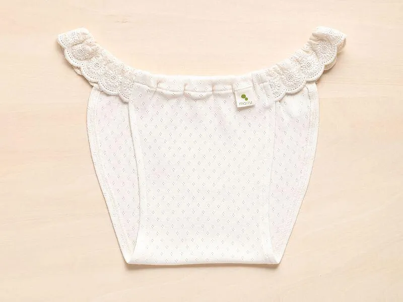 ※サンプル商品のため、パッケージなしでのお渡しになります。 マアルのこだわりを詰め込んだ代表的な一枚。 足の付け根やお腹を締めつけないデザインと、愛らしいレースが特徴。 2010年の創業以来、多くの方に愛され続けています。 一度身につけると手放せなくなる快適さ。 マアルのショーツのはじめの一枚としておすすめです。 素材はフェアトレードのオーガニックコットン100%。 縫い糸やオリジナルのエンブロイダリーレースも、栃木県の工場で特別にオーガニックコットン糸だけで作っています。 一般的な下着は、伸縮性があり廉価な化学繊維の糸で縫いますが、 肌が繊細な方は化繊糸に痒みを感じることが多いため、独自の方法で1着1着、オーガニックコットン糸を使い国内の縫製工場で縫っています。 地模様のあるオーガニックコットン生地は、伸縮性があり、とても柔らか。 コットンの持つ天然の油分を適度に含んでおり、しっとりふわふわとした感触。 無農薬有機栽培で育てた綿を、極力化学物質を使わず、漂白も染めも一切せずに、 国内で丁寧に編んだ生地です。 綿の栽培から糸づくりまで、世界的なソーシャルプロジェクト=bioRe PROJECT が担っており、 気持ちがいい!と感じた肌着が、どこまで遡ってもマアルく気持ちのいいフェアトレードの関係で生まれたものであるようにと願っています。 マアルのショーツは股上がかなり浅めです。 これは、ゴム部を骨盤輪の上に乗せることで、腸を締め付けないようにするためです。 だから、お腹の大きな妊婦さんでも履き続けることができます。 また、浅ばきであるため、一見冷えそうに見えますが、 足の付け根(鼠蹊部)やお腹周りを締め付けないことで、 体温の上昇作用も大学との共同調査で明らかになりました。 品質表示ラベルは、あえて外側に。 取り外しやすいよう、大きめのミシン目で本体の縫い目とは別に取り付けてあります。 これも、肌刺激を減らす工夫です。 また、ゴム交換口を用意してあります(左前のブランドタグの内側あたり)。 お好みの緩め具合に調整したり、太った、痩せた、妊娠したなどといった体の変化にも対応できます。 サイズ:S(W58~64cm H82~90cm)     M(W64~70cm H87~95cm)     L(W69~77cm H92~100cm)     LL(W77~85cm H102~110cm)     (W:ウエスト H:ヒップ)