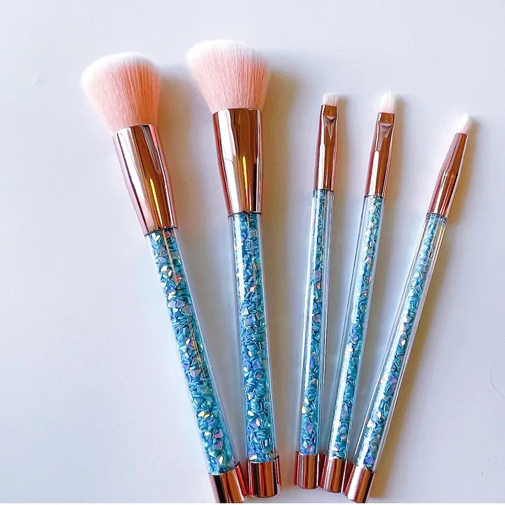 きらめくソーダカラーのメイクブラシ5本セットです。 太陽の光をあびると、さらにキラキラ輝き写真映えするアイテムです。 ブラシ部分は上質なナイロン素材でふんわり柔らかく、肌に優しい塗り心地。人口毛なのでお手入れも簡単で、丈夫で長持ちします。 シェーディングブラシを使うと簡単にお顔が一回り小さくなる印象になるのでオススメしています! アイシャドウブラシ2は涙袋がぷっくり可愛く作れてGOOD◎! <ブラシのセット内容と使い方> 1.チークブラシ ほおの高い部分にふわっとのせると顔がぱっと明るく見えます。 2.シェーディングorハイライトブラシ フェイスラインに影を入れて小顔に。もしくはTゾーンや鼻筋にハイライトパウダーを入れて顔を 効果的に立体的に見せるのに適しているブラシです。 3.アイシャドウブラシ1 アイホールや二重幅、目尻やノーズシャドウなど、ふわっとアイシャドウを塗るのに適した形状です。 4.アイシャドウブラシ2 下瞼や目の際にライン状にアイシャドウを塗るのに適した形状です。細かなアイメイクにぴったりなブラシです。 5.アイブロウブラシ 眉の隙間を埋めたり、眉頭に影を入れて立体的な眉が作れます。