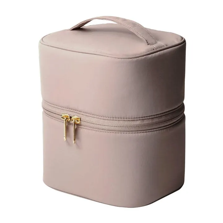 「メイクアイテムを厳選しないと入らない」というお悩みがある方や、スキンケアボトル、コンパクト類まで全てまとめたい方におすすめのバニティポーチです。 手持ちのメイクアイテムやスキンケアアイテム、 縦長サイズのものが多くないですか? メイクブラシ、リップグロス、アイブロウペンシルや、 化粧水、乳液、ボディクリームやヘアオイルなど、 実は縦長サイズのものが多いことに気付きます。 atRiseから新たに生まれた化粧ポーチは、 そんな縦長アイテムも収納しやすいトールデザイン。 細長いアイテムはギャザーポケットを活用して仕分けができ、 中でバラバラになる心配はありません。 高さはあるものの、真ん中のファスナーで開ける仕様なので、 中のアイテムが一目で見て分かるデザイン。 背の低いアイテムや小さなアイテムも取り出しやすくなっています。 スタッフ一番のこだわりポイントは、上蓋の収納ポケット。 デッドスペースの上蓋部分が活躍できるようにデザインしました。 ファスナーポケットには、替えのパフや、 ストックアイテムを入れるのがオススメ。 オープンポケットには、ポケットティッシュやコットンなど、 サッと取り出したいものを入れるのがオススメです。