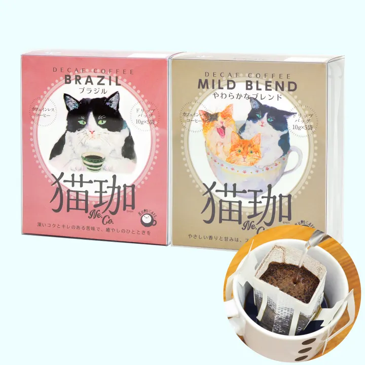 ※こちらはサンプル商品のため通常より賞味期限が短い場合もございます ※配送段ボール内で、別の種類の商品が区別なく一緒に入った状態となります。 ※パッケージ箱内の、1つ1つの個包装パッケージは無地(商品画像参照)です。ご注意ください。 ___________________ ⚫︎「デカフェ 猫珈 ブラジル ドリップバッグ5ヶ入」 カフェインレスブラジルコーヒー。 ゆっくりと落ち着いた夜や、スイーツと一緒に飲みたいのは、ちょっと苦めのブラジルコーヒー。 猫珈のブラジルは深いコクの出る深煎り。 深いコクとキレのある苦み。カフェインレスを感じさせないしっかりとした味を、ぜひお楽しみください。 手軽なドリップバッグタイプなのでちょっとしたプレゼントにもおすすめです。 ___________________ ⚫︎「デカフェ 猫珈 やわらかなブレンド ドリップバッグ5ヶ入」 優しい香りと甘み、やわらかなブレンド珈琲。もちろん、カフェインレスです。 コク・香り・苦味のバランスが良く、飲みやすいブレンドです。 オリジナルのブレンドでブラックでももちろんおいしいのですが、ミルクやお砂糖とも相性が良いので気分に合わせてお楽しみ頂けます。甘いスイーツと相性が良く、洋菓子だけでなく和菓子と一緒にいただくのもおすすめです。 手軽なドリップバッグタイプなのでちょっとしたプレゼントにもおすすめです。 ___________________ ※本品生産工場では大豆を使用した製品も製造しています。 ※コーヒー豆は生豆でカフェイン96%以上カットされた豆を焙煎 __________ [猫珈×どうぶつ基金] KUROCAFEの「DECAF 猫珈」は 公益財団法人どうぶつ基金様と提携。 売上の一部を寄付しています。 猫・犬の殺処分ゼロの社会を目指して 私たちにもできることで支援してまいります。