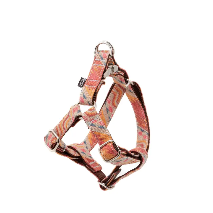 2024新色 オレンジ、テラコッタ、ブラウンの温かいトーンでデザインされたエスニック風の幾何学模様が特徴です。 リラックスしたお散歩や特別なイベントにぴったりの、ボヘミアンスタイルを楽しめます。 こちらの商品は繊細な糸で作られているため、活発で遊び好きな犬には向いておりませんのでご注意ください。 特別で個性的なデザインを愛犬に。