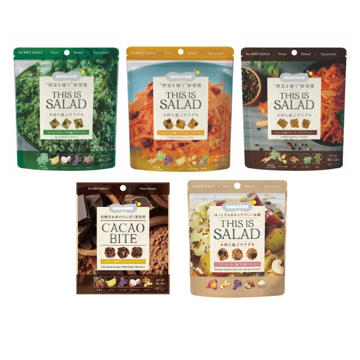 国産有機野菜使用のヘルシースナック詰め合わせ。 忙しい毎日でも、手軽においしく野菜の栄養が摂れる、栄養と美味しさを両立した商品です。 【セット内容】 ・THIS IS SALAD 持ち運びサラダシリーズ ケールとフルーツの板グラノーラ ・THIS IS SALAD 持ち運びサラダシリーズ にんじんの板グラノーラ  フルーツ ・THIS IS SALAD 持ち運びサラダシリーズ にんじんの板グラノーラ  ブラックペッパー ・CACAO BITE カカオと有機プロテインのクランチ ・THIS IS SALAD ”さつまいもと麹”の蜜クランチ