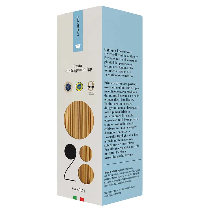 【イタリア版ミシュランGambero Rossoガンベロ・ロッソ TOPイタリアンフード受賞 プロが認める逸品】 ◎イタリア版ミシュランとも称されるレストラン格付け「Gambero Rosso(ガンベロ・ロッソ)」にて、栄誉ある「TOP ITALIAN FOOD賞」を受賞。 その味は、イタリア国内の著名なガストロノミーでも採用されており、プロからも高く評価される折り紙付きの逸品です。 ◎使用する素材はすべて無農薬。さらに、パスタの聖地グラニャーノ産で、PGI(地理的表示保護)認定を受けた品質です。 ◎各パッケージには、ブランド名の由来となった28人のパスタ職人たちの似顔絵とエピソードが描かれており、物語性あふれるデザインが魅力。  洗練されたビジュアルとストーリーが融合したおしゃれな仕上がりで、ギフトにもぴったりの逸品です。 ◎原産国 イタリア ◎ソースがよく絡むブロンズダイス製のパスタを使用。使いやすいスパゲティは、イタリアらしい風味を食卓にもたらしてくれます。  ●茹で時間:約7分  (日本人向けの場合は、表示時間より1~2分長めのゆで時間がおすすめです) グラニャーノパスタのIGP認定を受けたもちもちで良質なパスタ 職人の手による伝統的なパスタを製造している小さなパスタ工場、28PASTAIは1934年にイタリア、グラニャーノの渓谷に誕生しました。 農薬不使用のイタリア産デュラム小麦を使用して作られたパスタは、イタリアの美食家たちをも納得させる、深い味わいを誇ります。