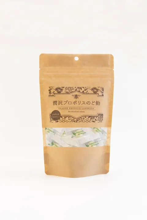 高濃度のプロポリスを1粒あたり62mg配合し、レモン風味の爽やかな味わいののど飴です。