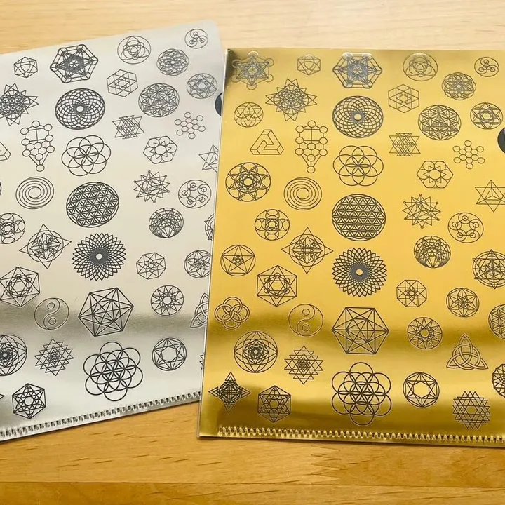 世界中に遺跡に刻まれた異次元に繋がる幾何学模様をA5ファイルに閉じ込め、持ち運びができるようにしました🌈 A5 金銀2枚セット 箔押し 片面は金銀ベタ印刷 片面は金銀抜き印刷 使い方は♾️です! ⭐️そのまま大切なものを保管するのに ⭐️ランチョンマットコースターがわりに ⭐️窓に貼ったり ⭐️パソコンの下に敷いたり 願いごとが叶っちゃうに違いない! ⚠️工場からプリントされたまま袋に詰めてあります。インクのにおいが気になる方は、一度干してお使いください。 また箔印刷は傷がつきやすくインクが落ちる場合もありますが、もし箔印刷が落ちても神聖幾何学模様の効果は変わりませんのでご安心してお使いください。