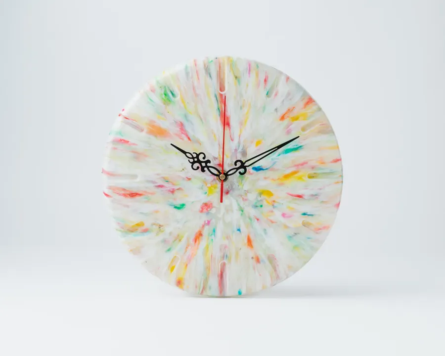 海洋プラスチックから生まれた、buoyの掛け時計です。 大きな文字盤に広がる表情豊かな模様は、空間のアクセントになります。 buoyの製品は、着色などの加工を一切加えず、海岸に漂着し回収された海洋プラスチックそのものの色味を活かしています。 明るい発色が魅力の素材ですが、複数の色が混ざり合うことで、有機的なモザイク模様に。 ひとつとして同じ表情がない、世界に一つだけの製品です。 日常に彩りを添える一品として。 自分へのご褒美にも、ギフトにもおすすめです。 ※単3電池を1本使用します。電池は同梱されていませんので別途ご購入ください。