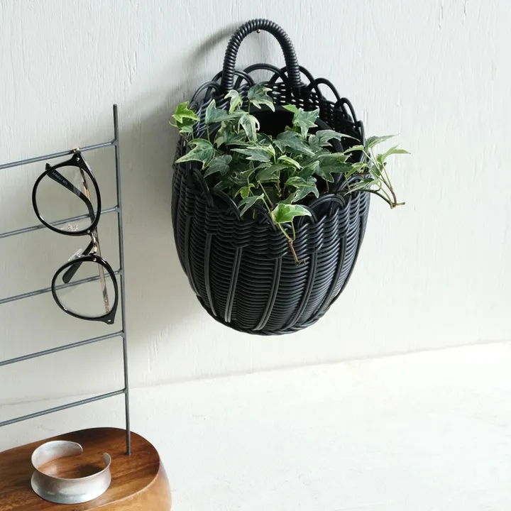 水洗いができるPPバンドを使った壁掛けタイプのプラントバスケットです。 Lサイズには4号鉢、Sサイズには3号鉢が入るサイズになっています。 自立する形なので置いて使うことも可能です。 水がかかりやすいキッチンや洗面周りの収納としても使っていただけます。