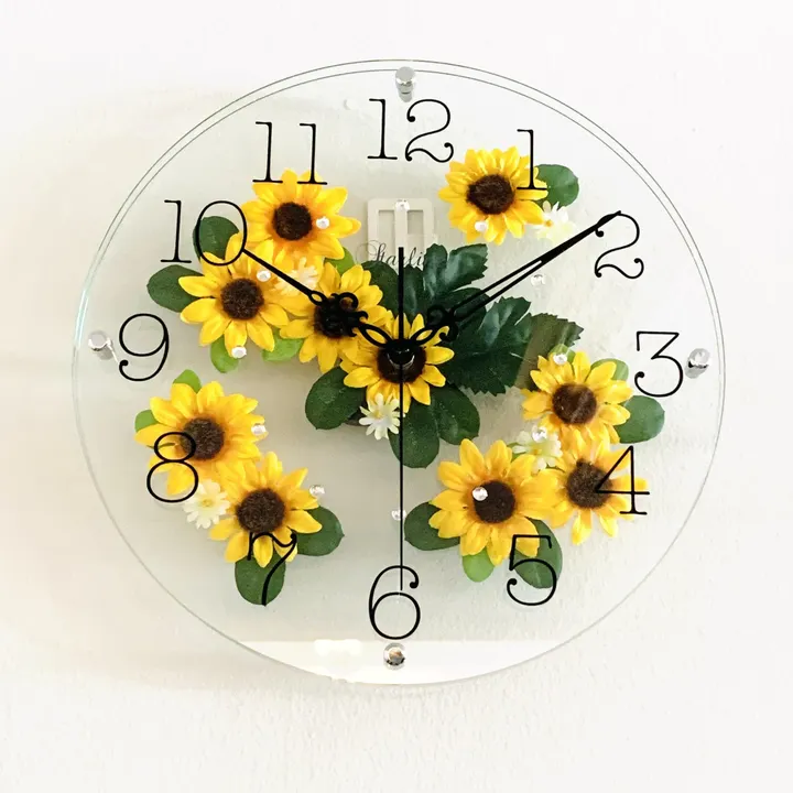 2枚のクリアなガラスに小さなひまわりの造花を挟んだ、当店人気のかわいくておしゃれな壁掛け兼用時計です。 ぱっと咲くひまわりにお部屋が明るくなります。 どんなインテリアにも調和し、日常を彩るアートピース。時間の経過を優雅に告げるこの時計は、目にするたびに笑顔を運びます。 リビング、寝室などはもちろん子供部屋でも可愛い! またひまわりには「憧れ」「情熱」「あなただけを見つめる」という花言葉があります。 母の日、誕生日、開店祝い、記念日など様々なシーンのプレゼントにも最適です。 ぜひこの機会にご利用くださいませ。