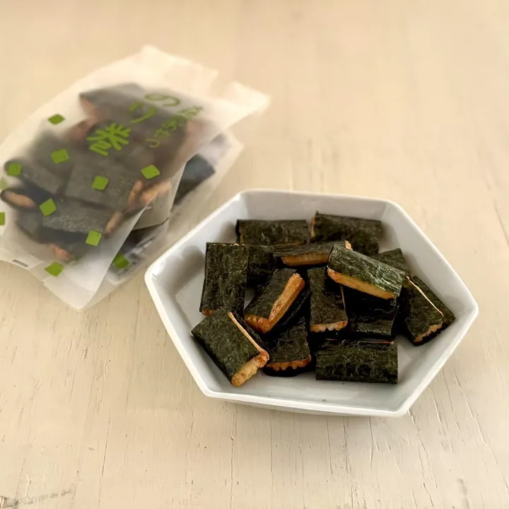 人気商品「のりまきあられ」をサイズダウンし、より食べやすく改良いたしました。 精米したての国産もち米を使い、さくっと香ばしく焼き上げたひとくちサイズのあられに、国産丸大豆たまり醤油と鹿児島県産の粗糖をからませ、有明産の海苔を巻いた「のり巻)。 もち米の自然な旨み、小麦フリーたまり醤油のコクのある風味、希少な有明産の海苔ならではの贅沢な香り。 素材の豊かなハーモニーが口の中に広がります。少し甘さを抑えたキリっとした甘辛醤油味が海苔と相性抜群。次から次へと手が伸びるおいしさです。