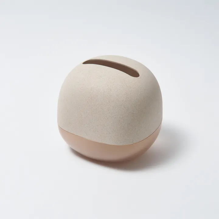残量が見える コンパクトなティッシュケース ボックスティッシュを詰め替えて、すっきりと置けるティッシュケース。 軽やかなツートーンデザインがアクセントになり、残量をさりげなく確認できます。 ティッシュを二つ折りにして収めることで、ボックスティッシュそのままよりも省スペースに。 ボックスティッシュの中身を二つ折りし、必要な分だけをコンパクトに収納。 200~240枚ほどを詰め替えると、スムーズにお使いいただけます。小さな空間にもそっと寄り添う、省スペース設計です。 ボックスティッシュから中身を取り出し、軽く折り曲げて仕切りに被せるだけで準備は完了。 シンプルに詰め替えでき、ケースの中でティッシュがきれいに収まります。 ※ティッシュの厚みや量によっては一度に全量入らないものもございます。 ※一般的なサイズ(厚み約40~50mm・枚数 200~240枚(100~120組)を目安)の ボックスティッシュやソフトパックティッシュの中身が収まります。 下半分のクリア素材が、ティッシュの減り具合をさりげなく伝えてくれます。 上半分のニュアンスのあるカラーとのコントラストは、オブジェのような気配を纏いながら、インテリアに馴染みます。 程良い重みがあるので、ティッシュを引き抜いてもケースが浮き上がることなく、 スムーズに取り出せます。最後の一枚までストレスなくお使いいただけます。 角のない優しいフォルムが空間に穏やかさを添えます。 水に強い素材なので洗面所やキッチンでも気兼ねなく使用可能。 別売りのウェットティッシュケースと組み合わせれば、「清潔」のための道具も統一感のあるインテリアの一部に。 お米のもみ殻を含むバイオプラスチックTEXaと再生ポリカーボネートを使用した環境に配慮したプロダクトです。 TEXaはお米のもみ殻の粒が見えて、陶器のようなマットで優しい質感を実現。 透明感の美しい再生ポリカーボネートは自社の製造過程で出るロス品等をリサイクルしています。 サステナブル素材の特性上、粒感や色味のニュアンスに個体差があります。表情の違いをお楽しみください。 国内の工場で生産している日本製。 :: soemとは 大阪で100年続く業務用プラスチック製品メーカーが「愛着を持って長く大切に使っていただく」をコンセプトに展開するブランドです。 機能性と飾りたくなるような心に響くデザインに、長く大切に使っていただきたいという思いを込めています。