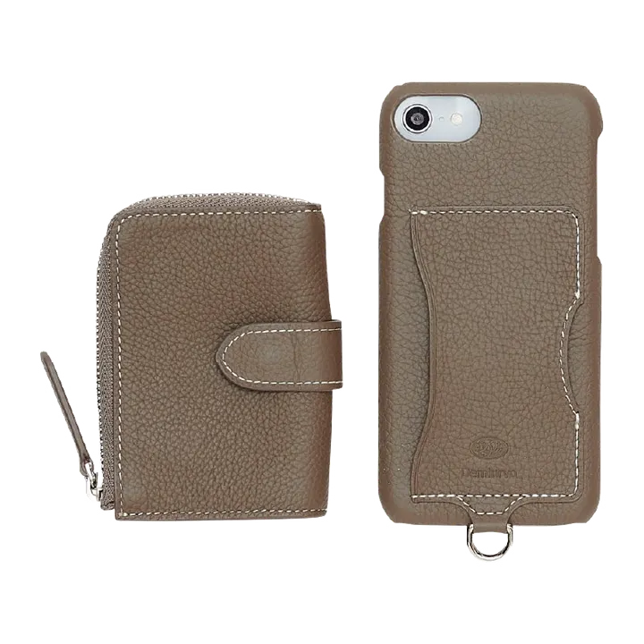 素材は、デミウルーボ の代名詞でもあるフランス産カウレザー。 L字ジップを開けると真ん中にコインスペースがあり、マチが広めで視認性と利便性を兼ね備えています。 コインスペースの両端には、カードや領収書などをドバッと入れることができるポケットがついており、 お札は三つ折り、もしくは4つ折りでしっかり収納できます。カスタムハードケースに装着できるようになっており、 シーンに合わせてスマホと財布をセットで持ち歩くことができます。 装着した状態でもそのままジップが開けられるようになっているので、取り外すことなく使用可能です。 単体としてももちろん、カスタムハードケースとセットでぜひご利用ください。 シンプルなデザインなので男女、年齢関係なくお使いいただけます。プレゼントにも最適です。 <カスタムハードケース> フランス産レザーを使った高級感あふれるレザーハードケース。 カード類を横から入れることができ、 ストラップでぶら下げても落ちないようにサイズ設計されています。 通常のクレジットカードなどは1枚、薄いカードは2枚入れることが可能です。