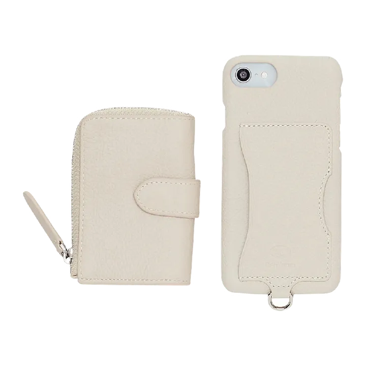 素材は、デミウルーボ の代名詞でもあるフランス産カウレザー。 L字ジップを開けると真ん中にコインスペースがあり、マチが広めで視認性と利便性を兼ね備えています。 コインスペースの両端には、カードや領収書などをドバッと入れることができるポケットがついており、 お札は三つ折り、もしくは4つ折りでしっかり収納できます。カスタムハードケースに装着できるようになっており、 シーンに合わせてスマホと財布をセットで持ち歩くことができます。 装着した状態でもそのままジップが開けられるようになっているので、取り外すことなく使用可能です。 単体としてももちろん、カスタムハードケースとセットでぜひご利用ください。 シンプルなデザインなので男女、年齢関係なくお使いいただけます。プレゼントにも最適です。 <カスタムハードケース> フランス産レザーを使った高級感あふれるレザーハードケース。 カード類を横から入れることができ、 ストラップでぶら下げても落ちないようにサイズ設計されています。 通常のクレジットカードなどは1枚、薄いカードは2枚入れることが可能です。