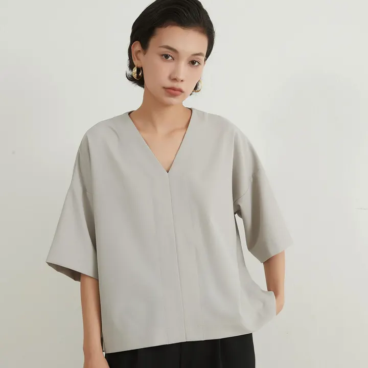 KNXT407・新色追加スラブ風速乾性シンプルVネックセンターシーム半袖トップ GREY/FREE