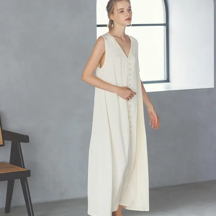 【デザイン・シルエット】 くるみボタンがアクセントに仕上がるワンピースのルームウェア。Vネックデザインで、お顔周りもすっきり見え◎ 長めの丈感ですが、フィット感のあるニットや、カーディガンとの相性が良く、上品な印象に。 【素材・サイズ感】サテン生地の肌触りのいい素材を使用。ゆったりしたサイズ感で、 ストレスフリーな着心地。アームホールも大きめな開きなので、腕回りもノンストレス。