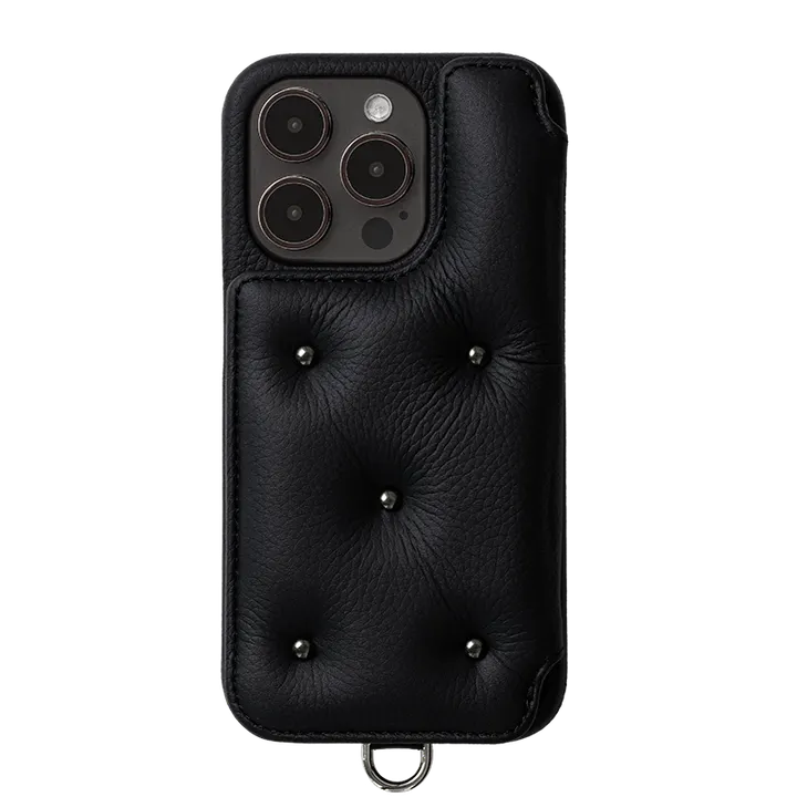 BALLON CINQ (バロン サンク)CINQは、フランス語で数字の5を表す言葉。特徴的なモコモコとしたレザーの表面に、円形の5つのスタッズがついたラグジュアリー且つ、スタイリッシュなモデル。デザインされたスタッズの大きさ、配置バランスは、見るたびに気分を上げてくれます。右扉の内側に2段のカードスリットと隠しポケット、左側に収納ポケットを備えた便利なアイテム。