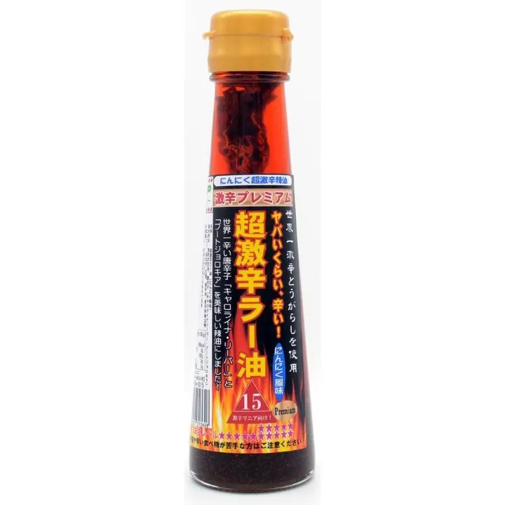 ★テレビ番組(有吉ゼミなど)や、YOUTUBEなどの激辛企画で、しばしば紹介されている超激辛ラー油です!本当にヤバい辛さですので、ご使用の際は分量などにくれぐれもご注意ください。 ★ギネス世界一認定の激辛とうがらしを使用!(キャロライナ・リーパー、ブートジョロキア) ★美味しくて激辛「ただ辛いだけではありません」香味野菜をたっぷり使用した超激辛辣油です! ★辛さは5辛・10辛・15辛・20辛、にんにく5辛・にんにく10辛・にんにく15辛・にんにく20辛の全8種類。20辛は一般的なラー油の50倍以上の辛さです。 ★ラーメン・麻婆豆腐・パスタ・焼きそば・焼き肉中華風冷奴・エビチリ・担担麺・塩焼きそば・おひたし・たこ焼きなど、ぜひお試しください!焼き肉のたれに少し加えたり、味噌汁にもお使いいただけます。豚キムチや鍋料理にも最適です! ★辛い食べ物がお好きな方は是非一度お試し頂きたいラー油です!少しでも辛さが際立つので経済的です。 【原材料・成分】 食用大豆油、唐辛子(キャロライナ―リーパー・ブートジョロキア)、野菜(長ねぎ・生姜)、香辛料、香辛料抽出物 【保存方法】 直射日光、高温多湿を避けて保存してください。
