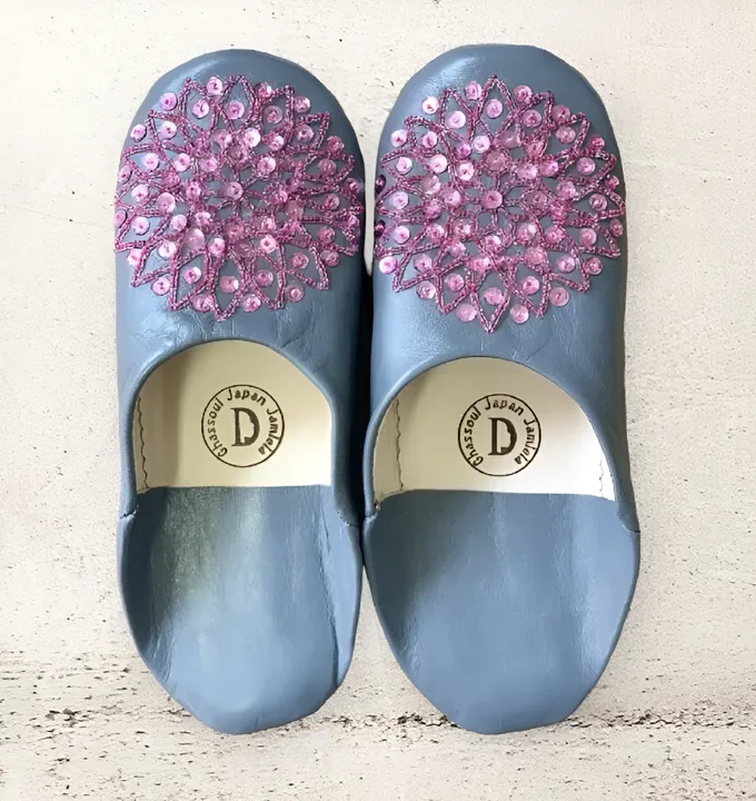 ・バブーシュとは革でできた室内履きです。 ・GJJが革と制作にこだわったオリジナルバブーシュです。 ・モロッコの様々なお花をイメージして作りました。オシャレなダブグレイベースに鮮やかなピンクのスパンコールが輝く女性らしく美しい素敵な一足です。 ☆革の特長☆ なめし加工を丁寧に行った機械仕上げの羊革のみを使用しております。 革本来の匂いはありますが、獣臭はありませんのでご安心ください。