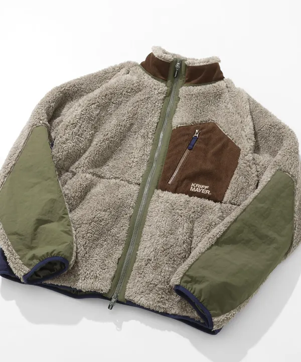 《KRIFF MAYER 秋冬人気アイテム「シャギーボアフリースジャケット」が今年も登場!》 フワフワな起毛感と、胸ポケットをコーデュロイ素材、脇部分とネック部分をマイクロフリースで切替えた、アウトドアライクなデザインが特徴的です。 今シーズンは切替を増やし配色感をプラスして、カジュアルさをアップさせました。 フロントファスナーには、手袋をしながらでも開閉がしやすいオリジナルの引き手をプラス。 内側に大容量ポケットを2つ配し、機能性も備えています。 裏地にメッシュ素材を使い、柔らかい着心地と保温性が長続き。 肩幅を気にせず動きやすいラグランスリーブ仕様。 各所に配色の3本針ミシンを落とし込み、遊び心のある見た目に仕上げました。 サッと羽織りやすく、ブルゾン型スタンドネックなので、好みのパーカーやシャツ、スウェットなど、気軽にレイヤードコーデが楽しめます。 街着としてももちろん、秋冬シーズンのキャンプやアウトドア使いにも映えるオススメアイテムです!