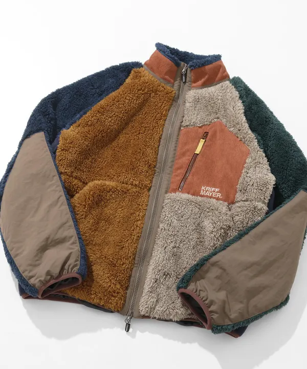 《KRIFF MAYER 秋冬人気アイテム「シャギーボアフリースジャケット」が今年も登場!》 フワフワな起毛感と、胸ポケットをコーデュロイ素材、脇部分とネック部分をマイクロフリースで切替えた、アウトドアライクなデザインが特徴的です。 今シーズンは切替を増やし配色感をプラスして、カジュアルさをアップさせました。 フロントファスナーには、手袋をしながらでも開閉がしやすいオリジナルの引き手をプラス。 内側に大容量ポケットを2つ配し、機能性も備えています。 裏地にメッシュ素材を使い、柔らかい着心地と保温性が長続き。 肩幅を気にせず動きやすいラグランスリーブ仕様。 各所に配色の3本針ミシンを落とし込み、遊び心のある見た目に仕上げました。 サッと羽織りやすく、ブルゾン型スタンドネックなので、好みのパーカーやシャツ、スウェットなど、気軽にレイヤードコーデが楽しめます。 街着としてももちろん、秋冬シーズンのキャンプやアウトドア使いにも映えるオススメアイテムです!