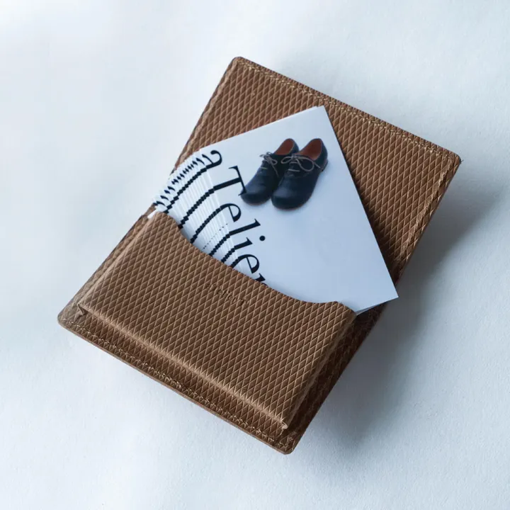 【質感とサイズ感を追求した】 革質・にぎりやすさ・使いやすさにこだわった名刺ケース ■作品説明 にぎったときの心地よさを追及して、企画段階では何度も試作を繰り返しており、サイズ感にはとことんこだわりました。 メインのポケットは最大50枚収納が可能で、対面には2つのサブポケットを設けております。 ■革素材 ひし型の模様が特徴であり、現在では幻の革と呼ばれている「ロシアンカーフ(※)」を、姫路のタンナーさん(製革業者)に再現して作っていただいたオリジナルのレザーです。 時を経るごとに風合いが出るように、タンニンとオイルを入れてもらっております。オイルをたくさん含んでいるので、使用による爪の跡や軽い当たりキズ(スレ)は、手でこすっていただきますと馴染んでわかりにくくなります。また、ひし形の模様があることで目立ちにくくもなっております。 ※ロシアンカーフとは、1700年代の帝政ロシアにおいて生産されていた高級皮革。1900年代前半のロシア革命時に、なめし製法の詳細が失伝してしまい、現在ではほとんど流通しておらず、希少性が高い素材です。当作品の使用している革は、そのロシアンカーフの表情を再現していただいております。 ■素材 牛革(姫路産) ■サイズ 本体:縦6.8×横11×厚み1.8cm 化粧箱:縦8.2×横12.2×厚み2.5cm ========================================================= ● 天然素材である本革を使用しています。シワ・傷・色ムラ・トラ等がある場合がございますが、本革が本来持っている特性ですのでご了承ください。 ● カラーはロットにより多少色が異なる場合がございます。掲載する写真映りや閲覧を頂く端末によっても色の見え方が異なることがあるかもしれませんがご了承ください。 ● 水に濡れますとシミの原因になります。摩擦や水濡れにより衣類との摩擦で色移りしますのでご注意下さい。また保管される際は風通しのよい場所でお願いいたします。色移りしやすいものとは避けてください。 =========================================================