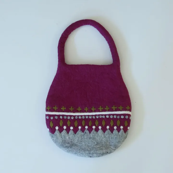 「ちょっぴりエキゾチックな毎日を」 その名の通り、スパイスを入れる壺をイメージしたバッグ。 ニードルワークが丁寧に美しく施され、柄はとてもゴージャス。 少しの非日常感を味わえます。 「カーブを描いたフォルム」 下に丸く膨らんだ楕円の形に心惹かれる方も多いのではないでしょうか。 携帯やハンカチ、ティッシュを入れてちょっとしたお出かけのお供にピッタリ。 「ネパールの「手仕事」集団!」 ネパールのフェアトレードNGO団体「Sana Hastakala」では組織運営に必要な分以上の利益が出た際、 編み手さん一人ひとりの生産量に比例した還付金が、サンクスカードを添えて手渡しで返されます。 その大量のサンクスカードは、実はオフィススタッフみんなで手書きしているもの。 代表のチャンドラさんに、「どうして手書きなの?」と尋ねると… 「うちは、名前がHastakala(手仕事)だからね。」との答えが。 仕事に対する情熱と誇りを、垣間見ることができました。 「贅沢なていねいさ、手仕事の味わい」 ノンミュールシングウールを使用した、フェルトの風合いに心ときめく3色。 丁寧に作られた手仕事のあたたかみで、心も体もぽかぽかに◎ 【2024秋冬新作】【フェアトレード】【エシカルコレクション】